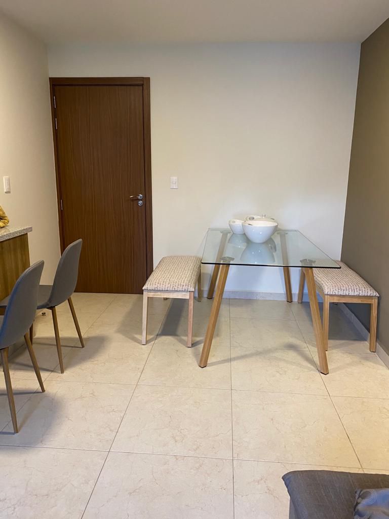 El departamento está completamente amueblado, éste modelo es el único con vestidor en la recámara principal, refrigerador de 27 pies dual, enfriador de vinos 18 botellas, sala con pantalla, comedor 6 personas, recamara King size, la recámara 2 con cama matrimonial, adornos decorativos, persianas enrollables blancas, canceles de vidrio templado en baños, luminarias de luz led cálida.